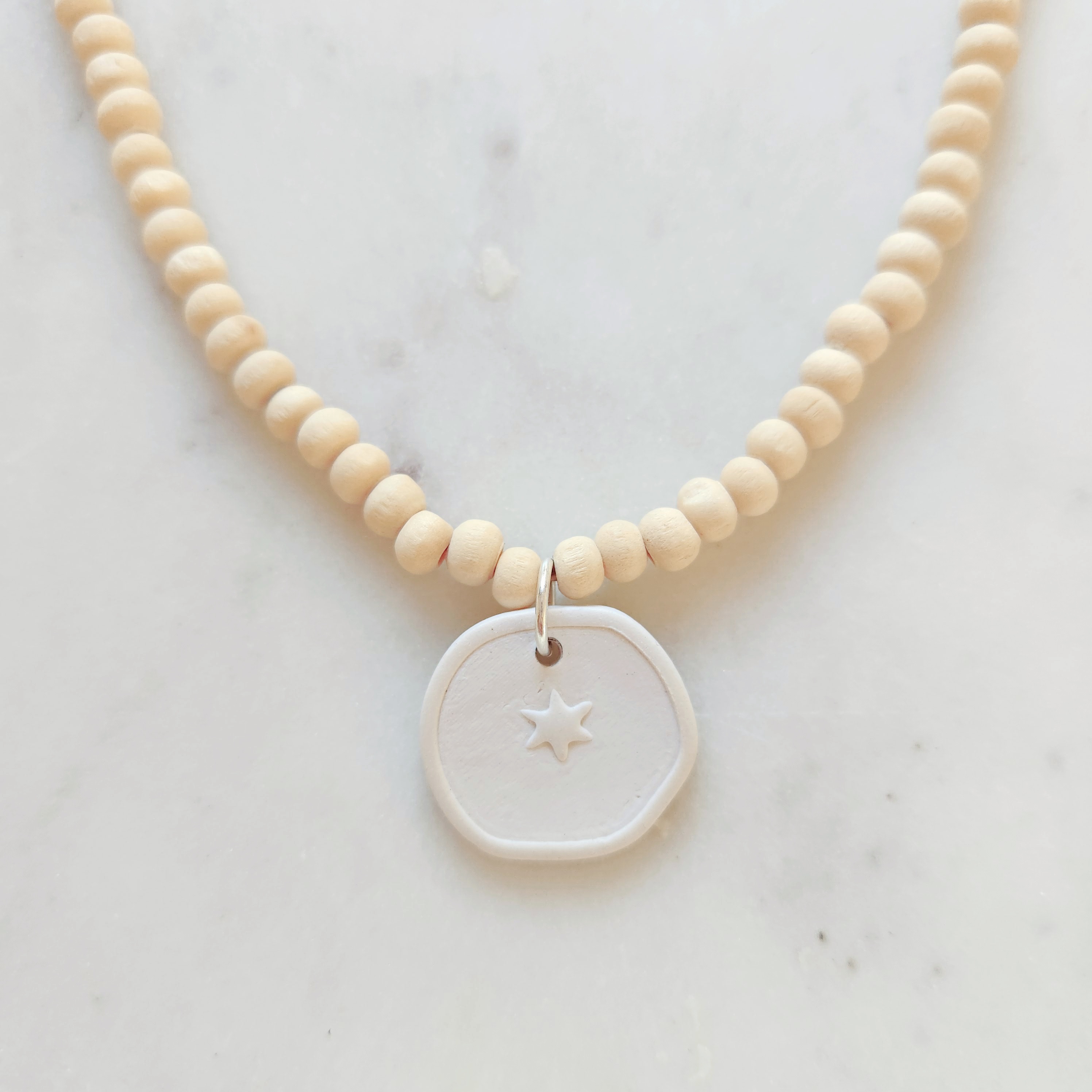 This handcrafted beaded necklace features smooth off-white wooden beads paired with a warm white star impression handmade clay pendant. Simple and intentional in design, the embossed pendant creates an earthy and modern focal point.